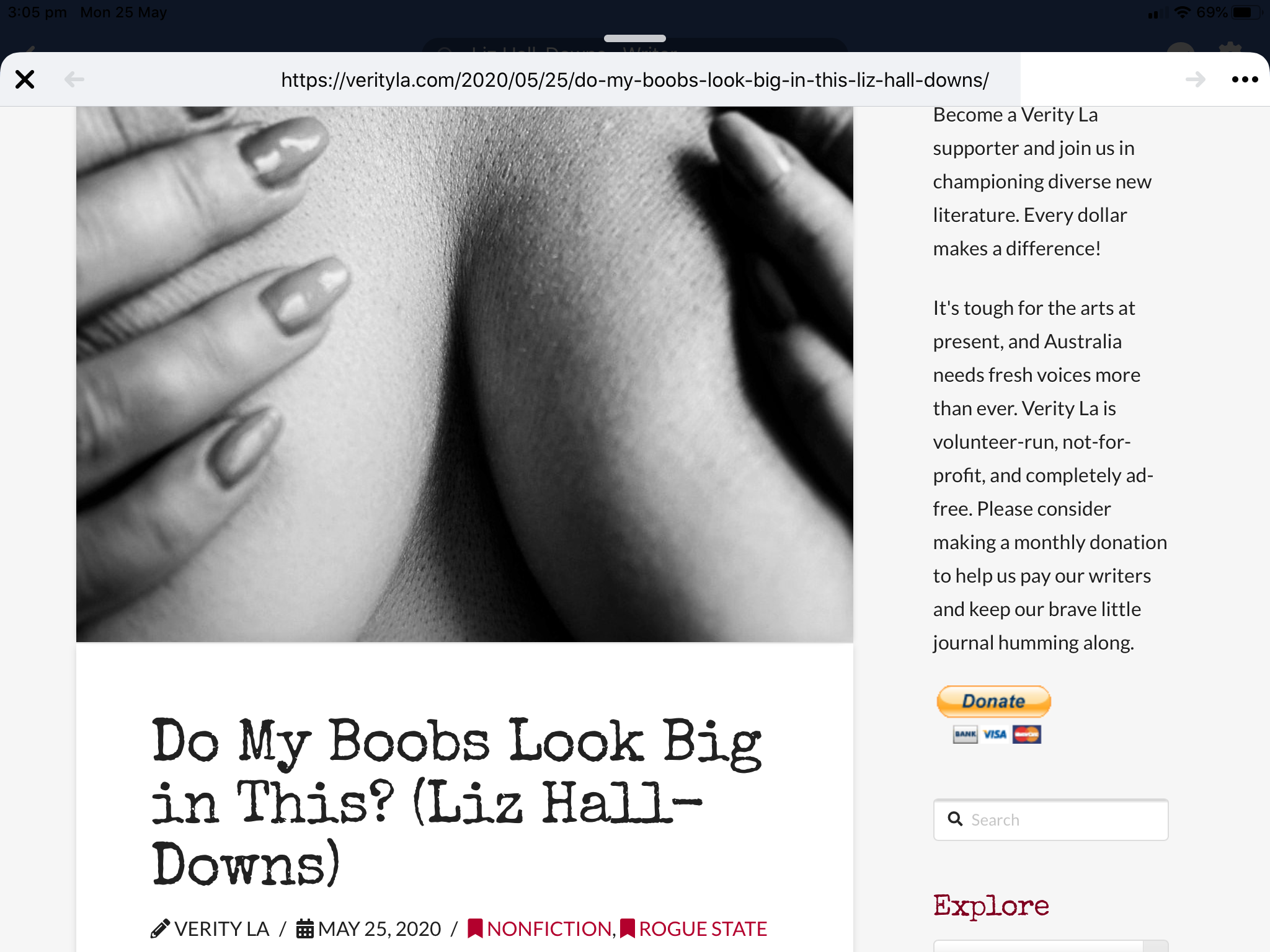 Love, love, love this essay, Liz, and the fact your experience with the surgery was successful (I remember, of course, you telling me about it a little while ago, and seeing your new ‘boob silhouette’ in Melbourne!). A joy to read a long piece written so well about the female body and experience and illness and recovery and love.