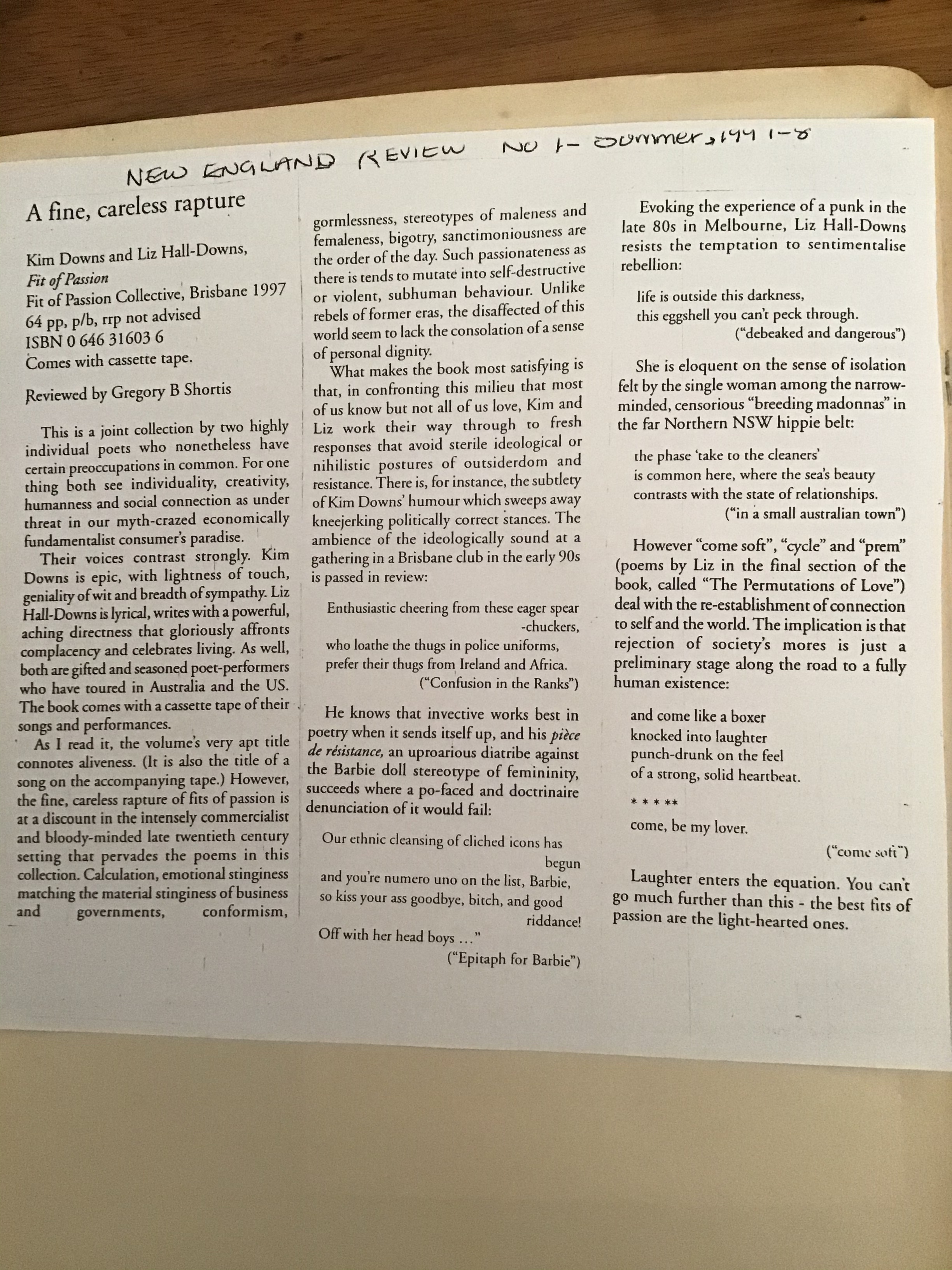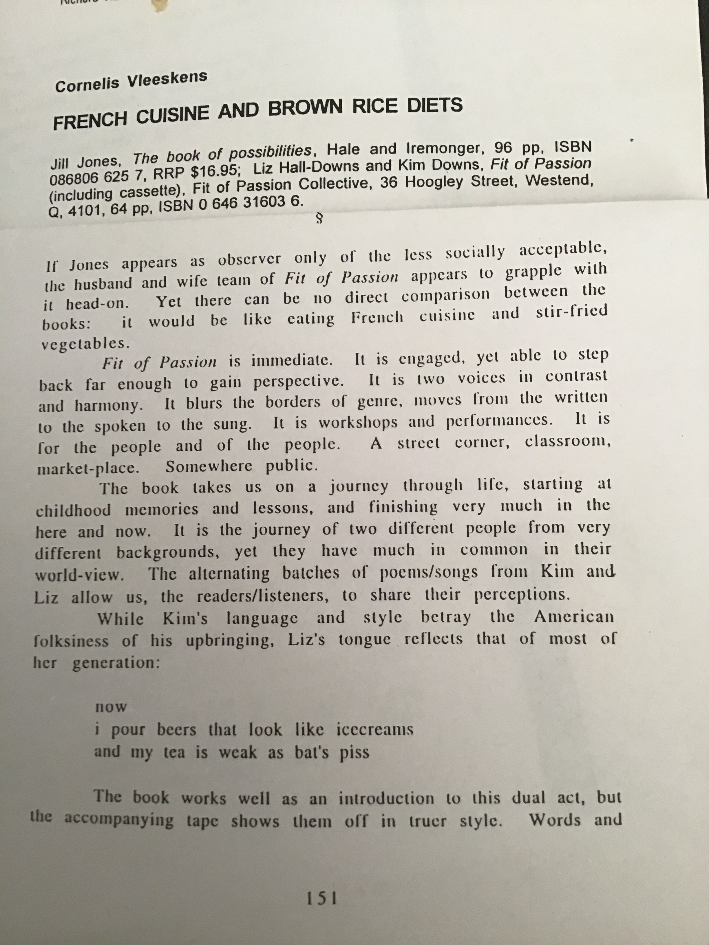 The review by the late Cornelis Vleeskins’ was found in our archives but somehow it’s source wasn’t recorded in the scrapbook, sorry. The ‘Rex’ he mentions was the late and much-loved Melbourne poet, Rex Buckingham.